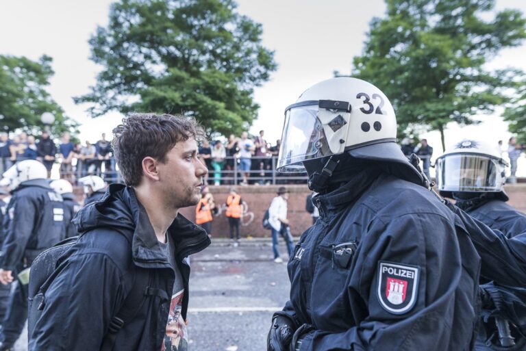GERMANY, HAMBURG – Ein Mann und ein Polizist liefern sich einen “Anstarrwettbewerb”, nachdem die “Welcome to Hell”-Demo gewaltsam von der Polizei zerschlagen wurde. +Mehr Material auf Anfrage möglich+ Vom 07.07-08.07.2017 fand der G20-Gipfel in Hamburg statt. Unter massiven Polizeiaufgebot trafen sich die Staats- und Regierungschefs der wichtigsten Industrie- und Schwellenländer. Über den gesamten Zeitraum und die Tage davor wurden hunderte verschiedenartige Protestaktionen und Demonstrationen gegen die Politik der G20 veranstaltet. Meist außerhalb davon begingen verschiedene Akteure, darunter Linksextremisten, Sachbeschädigungen, Plünderungen und Angriffe auf Polizeibeamte. Bei Ausschreitungen und Polizeiübergriffen wurden hunderte Personen verletzt.