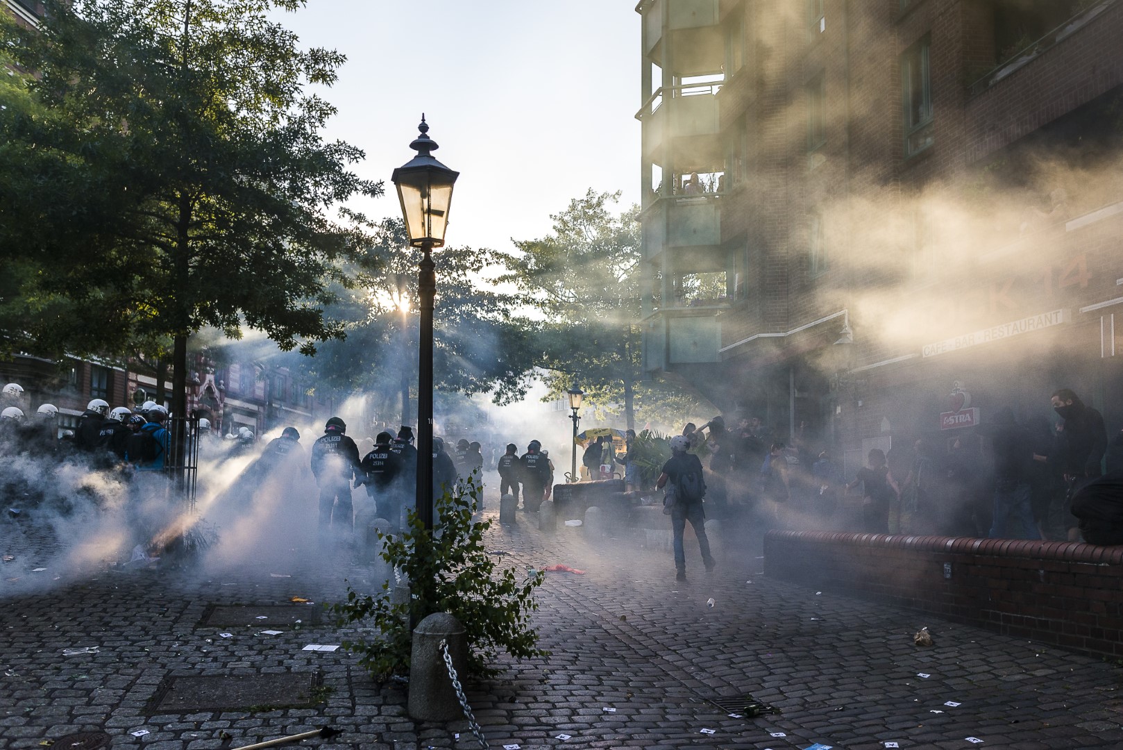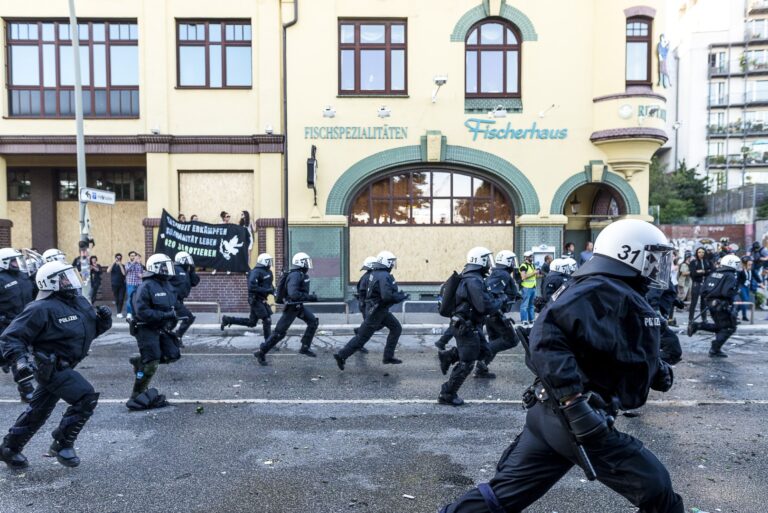GERMANY, HAMBURG – Nach der gewaltsamen Auflösung der “Welcome to Hell”-Demo wird der Fischmarkt geräumt, es kommt zu Jagdszenen. +Mehr Material auf Anfrage möglich+ Vom 07.07-08.07.2017 fand der G20-Gipfel in Hamburg statt. Unter massiven Polizeiaufgebot trafen sich die Staats- und Regierungschefs der wichtigsten Industrie- und Schwellenländer. Über den gesamten Zeitraum und die Tage davor wurden hunderte verschiedenartige Protestaktionen und Demonstrationen gegen die Politik der G20 veranstaltet. Meist außerhalb davon begingen verschiedene Akteure, darunter Linksextremisten, Sachbeschädigungen, Plünderungen und Angriffe auf Polizeibeamte. Bei Ausschreitungen und Polizeiübergriffen wurden hunderte Personen verletzt.