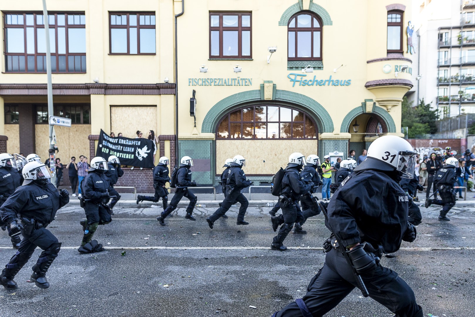 GERMANY, HAMBURG – Eine Gruppe Polizisten rennt auf der Hafenstraße, nachdem die “Welcome to hell” Demo eskalierte. +Mehr Material auf Anfrage möglich+ Vom 07.07-08.07.2017 fand der G20-Gipfel in Hamburg statt. Unter massiven Polizeiaufgebot trafen sich die Staats- und Regierungschefs der wichtigsten Industrie- und Schwellenländer. Über den gesamten Zeitraum und die Tage davor wurden hunderte verschiedenartige Protestaktionen und Demonstrationen gegen die Politik der G20 veranstaltet. Meist außerhalb davon begingen verschiedene Akteure, darunter Linksextremisten, Sachbeschädigungen, Plünderungen und Angriffe auf Polizeibeamte. Bei Ausschreitungen und Polizeiübergriffen wurden hunderte Personen verletzt.