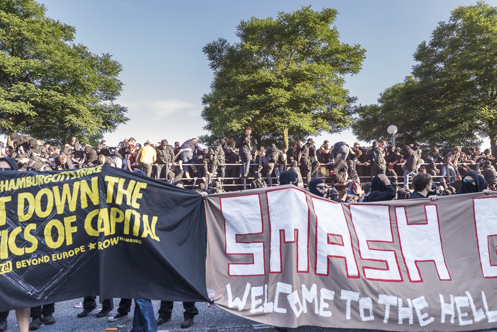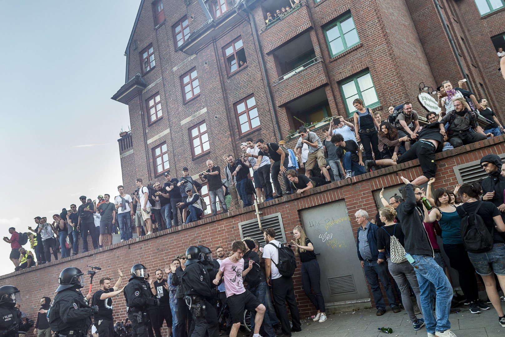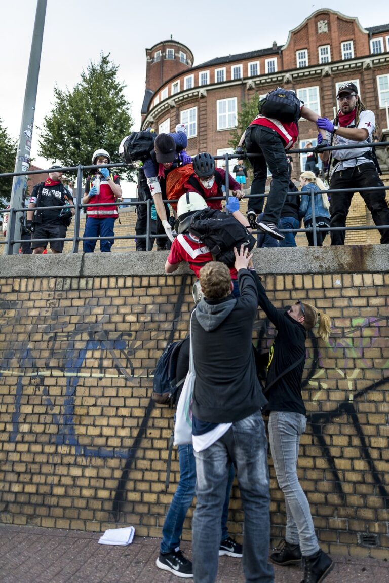 GERMANY, HAMBURG – Demonstranten helfen “Demo-Sanitätern” eine Mauer hochzukommen, nachdem die Polizei die Straße dicht gemacht hat. +Mehr Material auf Anfrage möglich+ Vom 07.07-08.07.2017 fand der G20-Gipfel in Hamburg statt. Unter massiven Polizeiaufgebot trafen sich die Staats- und Regierungschefs der wichtigsten Industrie- und Schwellenländer. Über den gesamten Zeitraum und die Tage davor wurden hunderte verschiedenartige Protestaktionen und Demonstrationen gegen die Politik der G20 veranstaltet. Meist außerhalb davon begingen verschiedene Akteure, darunter Linksextremisten, Sachbeschädigungen, Plünderungen und Angriffe auf Polizeibeamte. Bei Ausschreitungen und Polizeiübergriffen wurden hunderte Personen verletzt.
