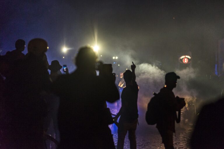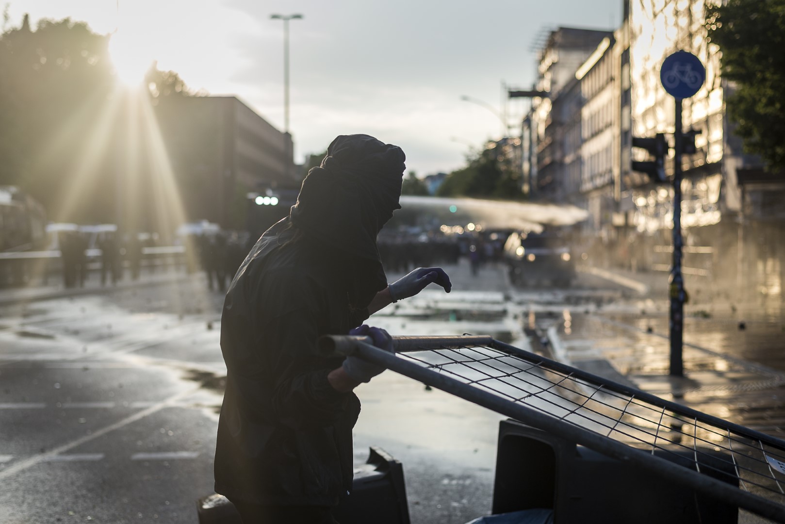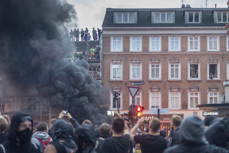 GERMANY, HAMBURG – Nach der Eskalation bei der “Welcome to Hell”-Demo kommt es am Abend im Schanzenviertel zu kleineren Auseinandersetzungen zwischen Polizei und Protestierenden. Hier: Ein Mann zeigt den Mittelfinger in Richtung eines Wasserwerfers auf dem Schulterblatt. Kleinere Feuer brennen, einzelne Flaschenwürfe, viel Presse. +Mehr Material auf Anfrage möglich+ Vom 07.07-08.07.2017 fand der G20-Gipfel in Hamburg statt. Unter massiven Polizeiaufgebot trafen sich die Staats- und Regierungschefs der wichtigsten Industrie- und Schwellenländer. Über den gesamten Zeitraum und die Tage davor wurden hunderte verschiedenartige Protestaktionen und Demonstrationen gegen die Politik der G20 veranstaltet. Meist außerhalb davon begingen verschiedene Akteure, darunter Linksextremisten, Sachbeschädigungen, Plünderungen und Angriffe auf Polizeibeamte. Bei Ausschreitungen und Polizeiübergriffen wurden hunderte Personen verletzt.