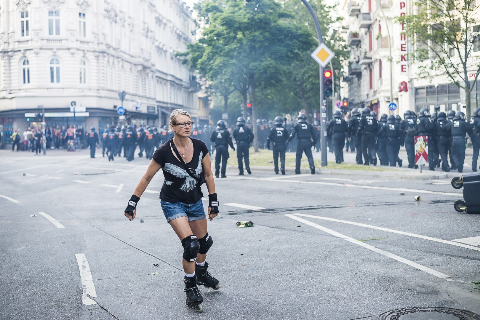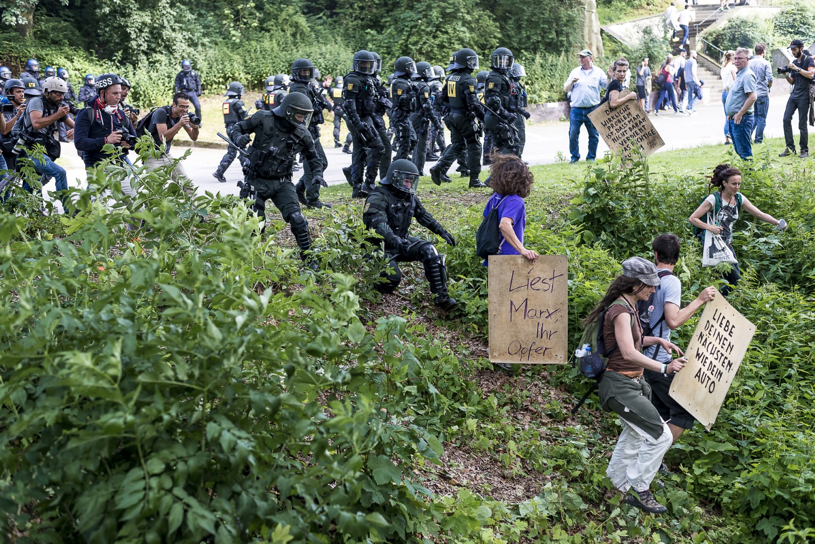 GERMANY, HAMBURG – Am Freitag Vormittag wurde versucht die Zufahrtswege der Gipfelteilnehmer zu blockieren. Diese Demonstrationsteilnehmer wurden durch die Polizei bis zur Kersten-Miles Brücke, nahe Landungsbrücken, getrieben. +Mehr Material auf Anfrage möglich+ Vom 07.07-08.07.2017 fand der G20-Gipfel in Hamburg statt. Unter massiven Polizeiaufgebot trafen sich die Staats- und Regierungschefs der wichtigsten Industrie- und Schwellenländer. Über den gesamten Zeitraum und die Tage davor wurden hunderte verschiedenartige Protestaktionen und Demonstrationen gegen die Politik der G20 veranstaltet. Meist außerhalb davon begingen verschiedene Akteure, darunter Linksextremisten, Sachbeschädigungen, Plünderungen und Angriffe auf Polizeibeamte. Bei Ausschreitungen und Polizeiübergriffen wurden hunderte Personen verletzt.
