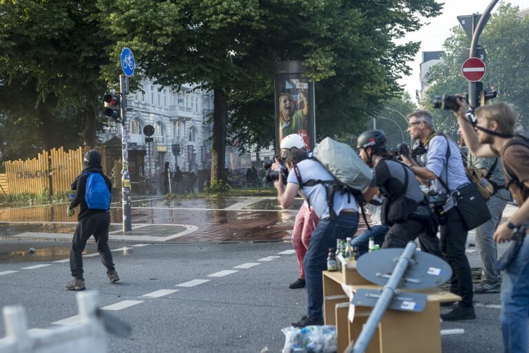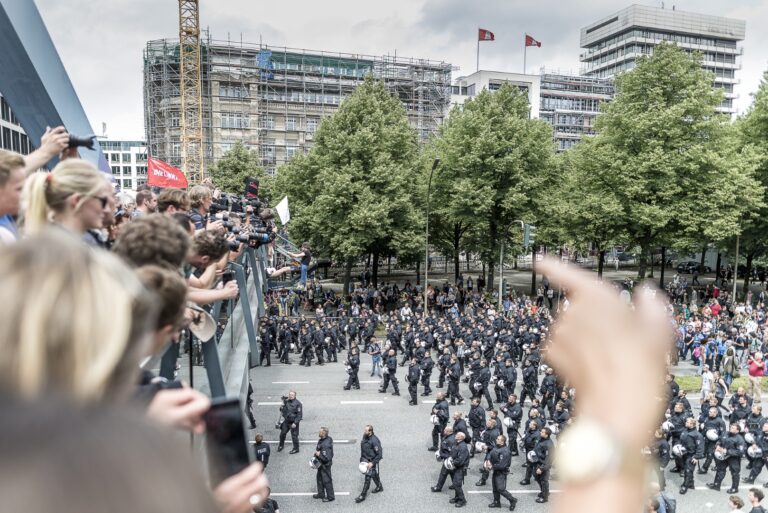Analog und digital, schwarz-weiß und in Farbe, mal mitten im Getümmel, mal mit etwas Abstand. Sechs FotografInnen zeigen in diesem Fotoband Motive einer eindrucksreichen G20-Protestwoche 2017 in Hamburg. Mit Interviews von Chris Grodotzki (Fotograf), Gudrun Schoppe & Rita Kohel (1000 Gestalten), Matthias Bartke (SPD), Gwen Wayne (Alles Allen), Holger Burner (Rapper), Halil Simsek (G20 entern), Jan van Aken (Die Linke), Guido Camillo (Demonstrant), Katharina Fegebank (Die Grünen), Nico Berg (Block G20), Jeanine Weigel (DGB Nord), Timo Zill (Polizei Hamburg), Oliver von Dobrowolski (PolizeiGrün e.V.) und einem Geleitwort von Martin Dieckmann (dju in ver.di). GudbergNerger Verlag, Seitenzahl: 238 Seiten, ISBN-10: 3945772443