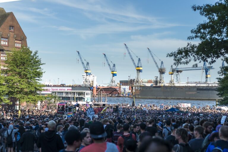 GERMANY, HAMBURG – Beginn der “Welcome to hell” Demo auf dem Fischmarkt. Dort gab es noch ein Konzert u.a. von “Neonschwarz”. +Mehr Material auf Anfrage möglich+ Vom 07.07-08.07.2017 fand der G20-Gipfel in Hamburg statt. Unter massiven Polizeiaufgebot trafen sich die Staats- und Regierungschefs der wichtigsten Industrie- und Schwellenländer. Über den gesamten Zeitraum und die Tage davor wurden hunderte verschiedenartige Protestaktionen und Demonstrationen gegen die Politik der G20 veranstaltet. Meist außerhalb davon begingen verschiedene Akteure, darunter Linksextremisten, Sachbeschädigungen, Plünderungen und Angriffe auf Polizeibeamte. Bei Ausschreitungen und Polizeiübergriffen wurden hunderte Personen verletzt.