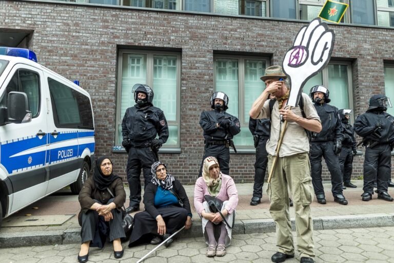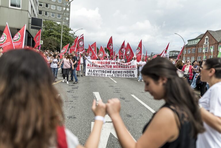 GERMANY, HAMBURG – Auf der Großdemonstration “Solidarität statt G20” mit ca. 100.000 Teilnehmern. Es nehmen viele verschiedene Parteien, NGOs, Organisationen und Gruppen teil. Hier sieht man den Block der alevitischen Gemeinde Hamburg und Umgebung. +Mehr Material auf Anfrage möglich+ Vom 07.07-08.07.2017 fand der G20-Gipfel in Hamburg statt. Unter massiven Polizeiaufgebot trafen sich die Staats- und Regierungschefs der wichtigsten Industrie- und Schwellenländer. Über den gesamten Zeitraum und die Tage davor wurden hunderte verschiedenartige Protestaktionen und Demonstrationen gegen die Politik der G20 veranstaltet. Meist außerhalb davon begingen verschiedene Akteure, darunter Linksextremisten, Sachbeschädigungen, Plünderungen und Angriffe auf Polizeibeamte. Bei Ausschreitungen und Polizeiübergriffen wurden hunderte Personen verletzt.