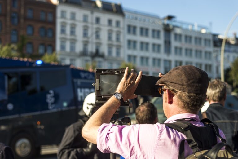 GERMANY, HAMBURG – Ein Mann fotografiert mit einer alten Plattenkamera auf der “Welcome to hell” Demo. +Mehr Material auf Anfrage möglich+ Vom 07.07-08.07.2017 fand der G20-Gipfel in Hamburg statt. Unter massiven Polizeiaufgebot trafen sich die Staats- und Regierungschefs der wichtigsten Industrie- und Schwellenländer. Über den gesamten Zeitraum und die Tage davor wurden hunderte verschiedenartige Protestaktionen und Demonstrationen gegen die Politik der G20 veranstaltet. Meist außerhalb davon begingen verschiedene Akteure, darunter Linksextremisten, Sachbeschädigungen, Plünderungen und Angriffe auf Polizeibeamte. Bei Ausschreitungen und Polizeiübergriffen wurden hunderte Personen verletzt.