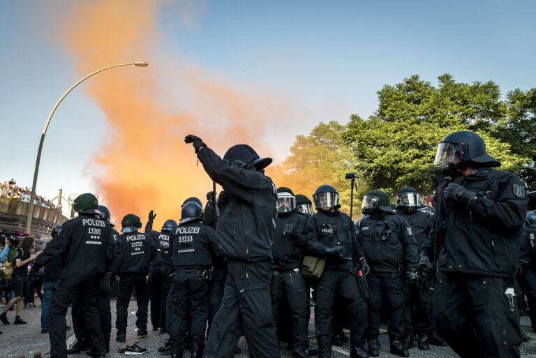 GERMANY, HAMBURG – Orangener Rauch steigt hinter einer Reihe von Polizisten auf, nachdem die “Welcome to hell” Demo eskalierte. +Mehr Material auf Anfrage möglich+ Vom 07.07-08.07.2017 fand der G20-Gipfel in Hamburg statt. Unter massiven Polizeiaufgebot trafen sich die Staats- und Regierungschefs der wichtigsten Industrie- und Schwellenländer. Über den gesamten Zeitraum und die Tage davor wurden hunderte verschiedenartige Protestaktionen und Demonstrationen gegen die Politik der G20 veranstaltet. Meist außerhalb davon begingen verschiedene Akteure, darunter Linksextremisten, Sachbeschädigungen, Plünderungen und Angriffe auf Polizeibeamte. Bei Ausschreitungen und Polizeiübergriffen wurden hunderte Personen verletzt.