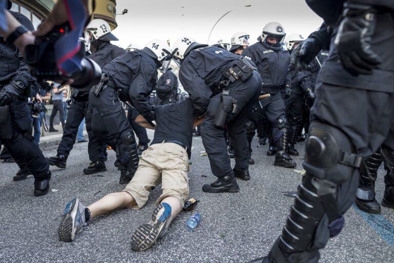 GERMANY, HAMBURG – Ein zu Boden gegangener Demonstrant wird von zwei Polizisten an die Seite gebracht. +Mehr Material auf Anfrage möglich+ Vom 07.07-08.07.2017 fand der G20-Gipfel in Hamburg statt. Unter massiven Polizeiaufgebot trafen sich die Staats- und Regierungschefs der wichtigsten Industrie- und Schwellenländer. Über den gesamten Zeitraum und die Tage davor wurden hunderte verschiedenartige Protestaktionen und Demonstrationen gegen die Politik der G20 veranstaltet. Meist außerhalb davon begingen verschiedene Akteure, darunter Linksextremisten, Sachbeschädigungen, Plünderungen und Angriffe auf Polizeibeamte. Bei Ausschreitungen und Polizeiübergriffen wurden hunderte Personen verletzt.