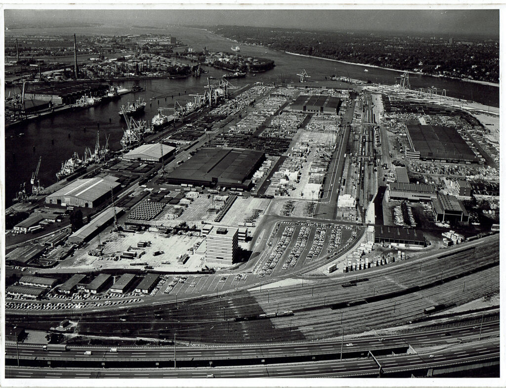 Luftbildaufnahme vom Burchardkai im Hamburger Hafen, Aufnahme irgendwann zwischen 1972 und 1979.