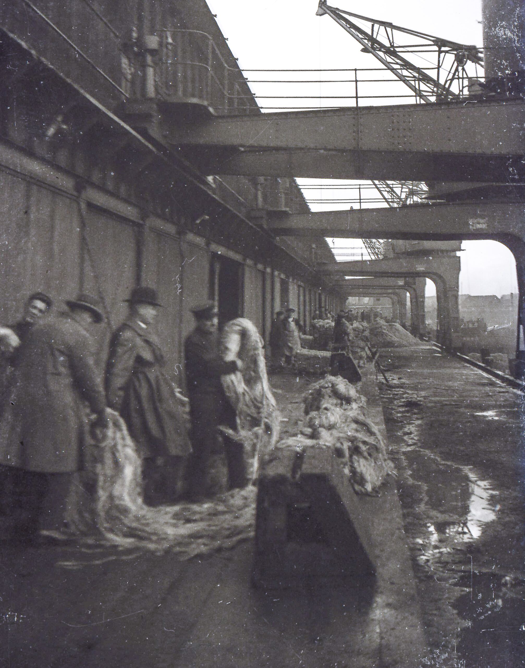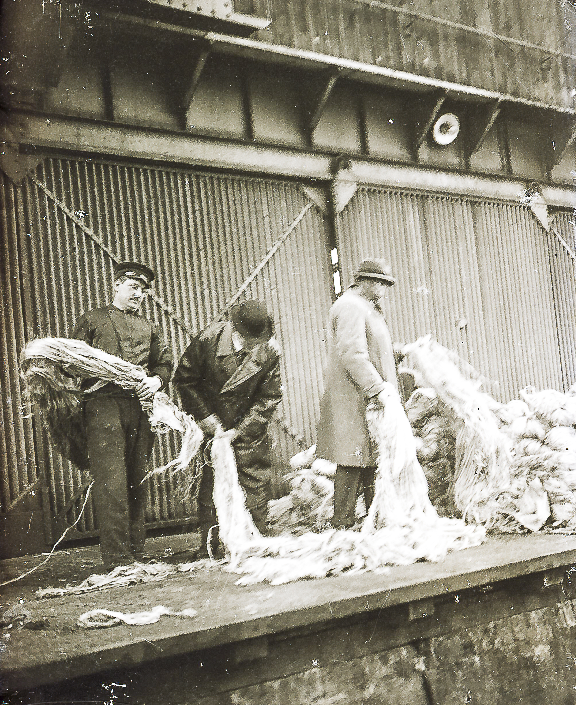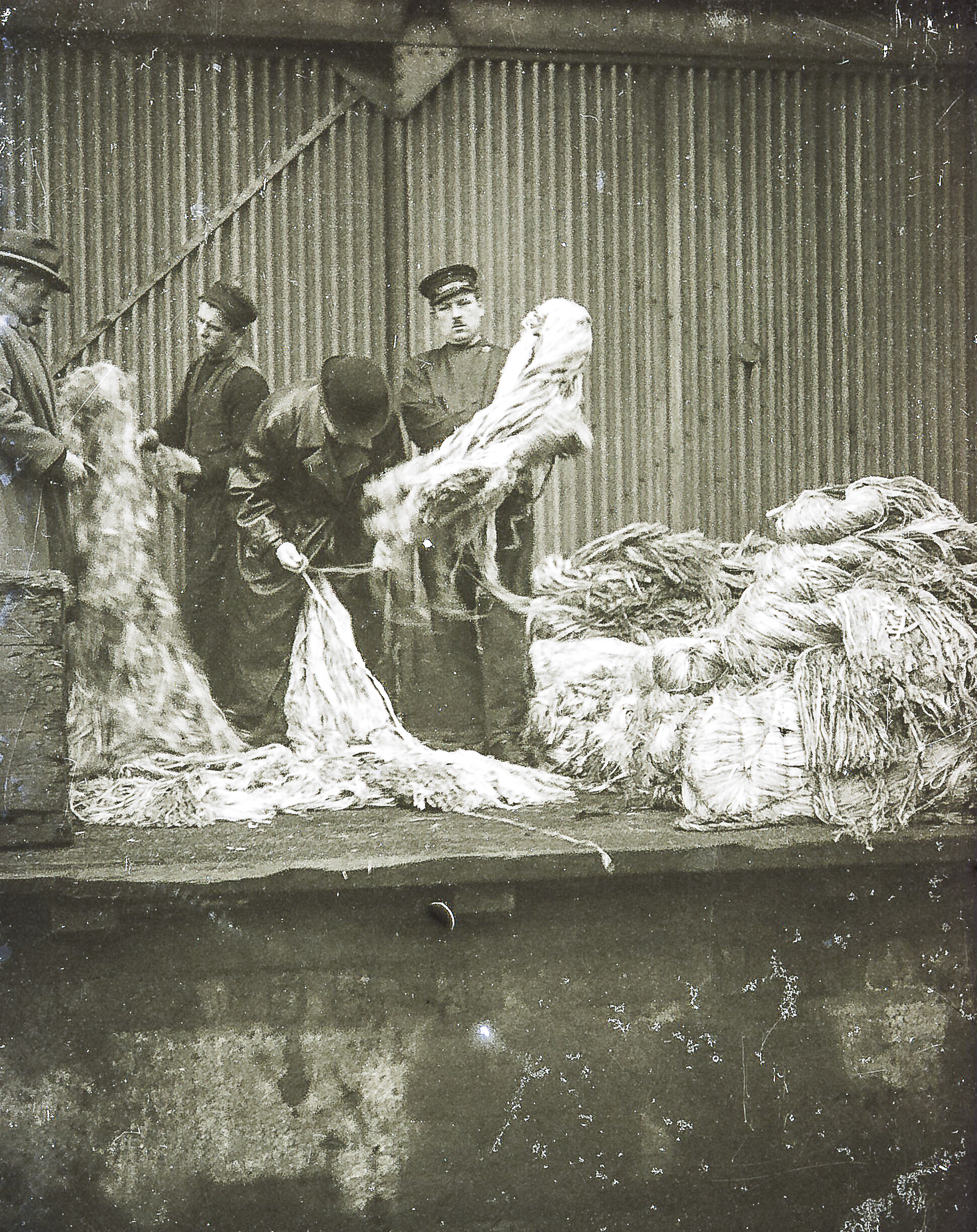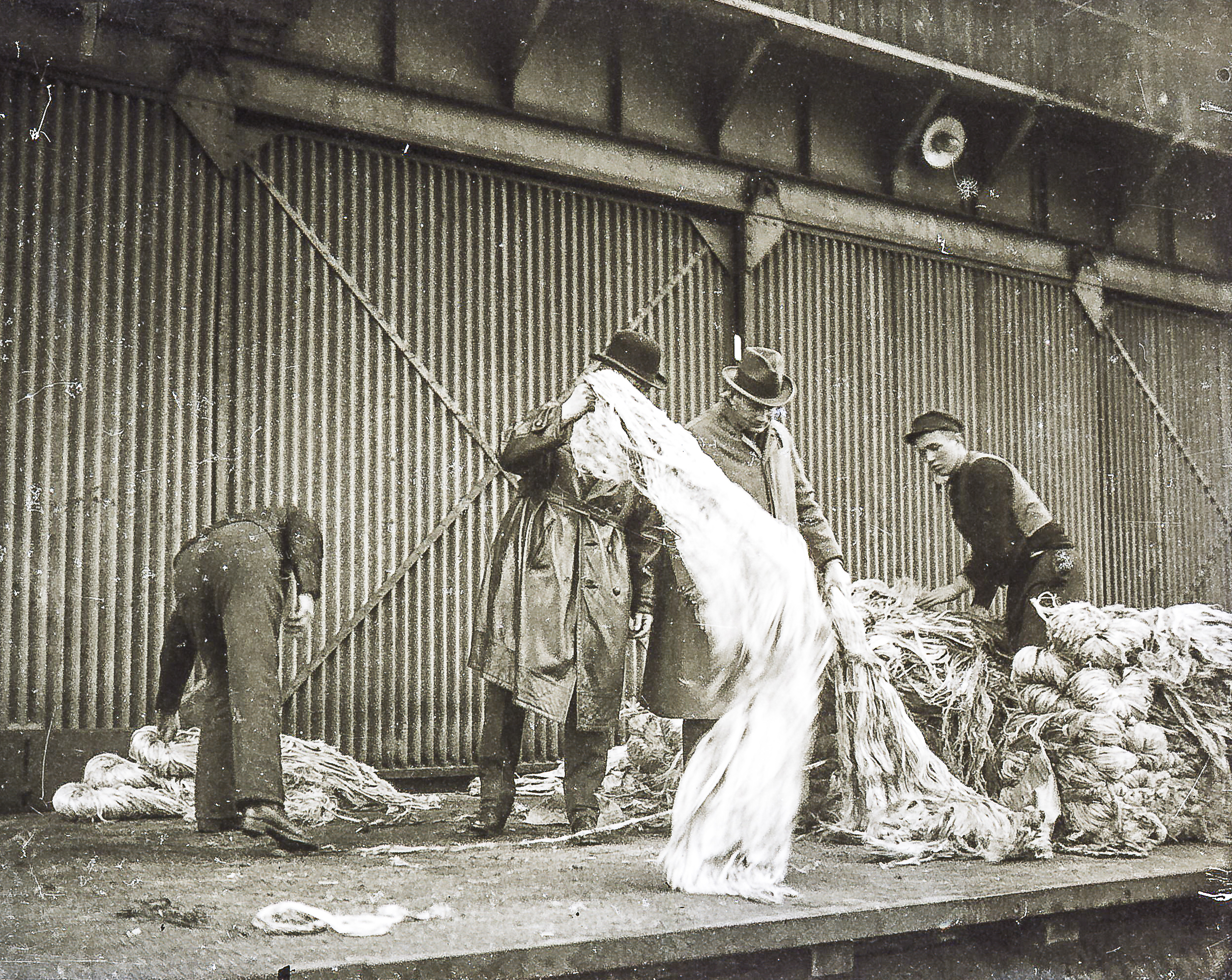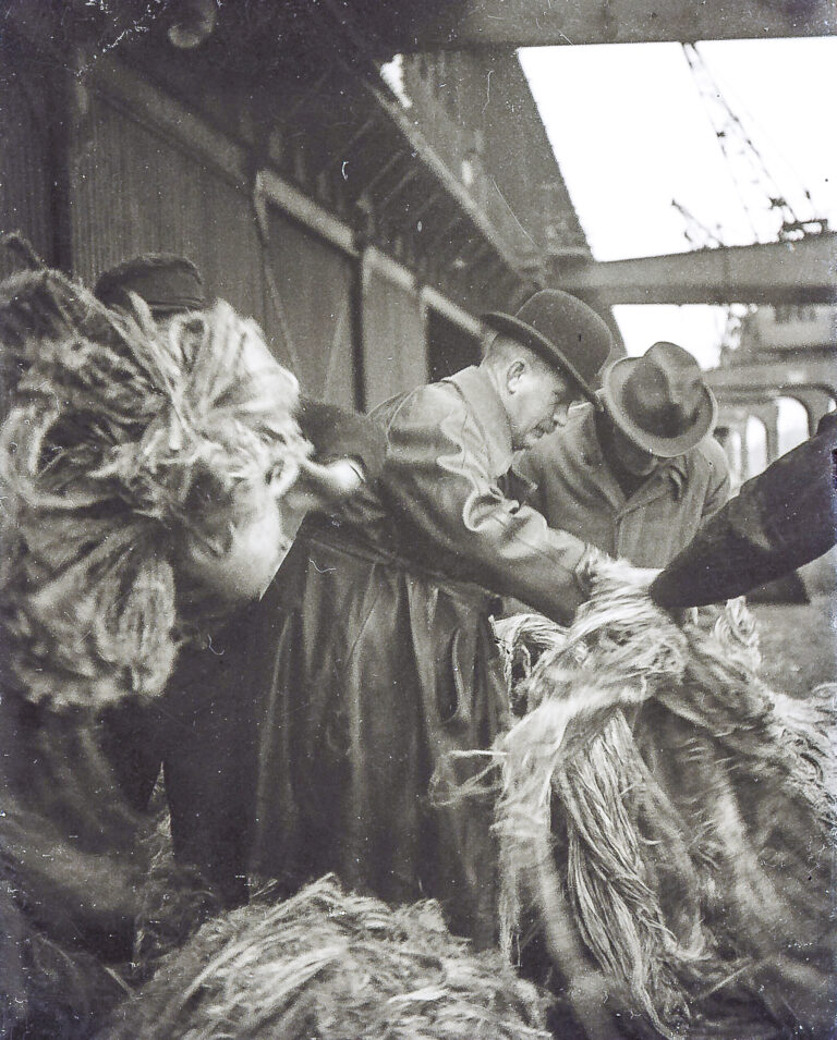 1925 – Kaiarbeiter (im Arbeitszeug) mit Quatiersleuten/Kaufleuten, die die Ware/Qualität in Augenschein nehmen (mit Lehrling). Die Ware Agaven-Sisal aus Südamerika kommend. Unbekannte Amateuraufnahme, auf Glas-Negativen.